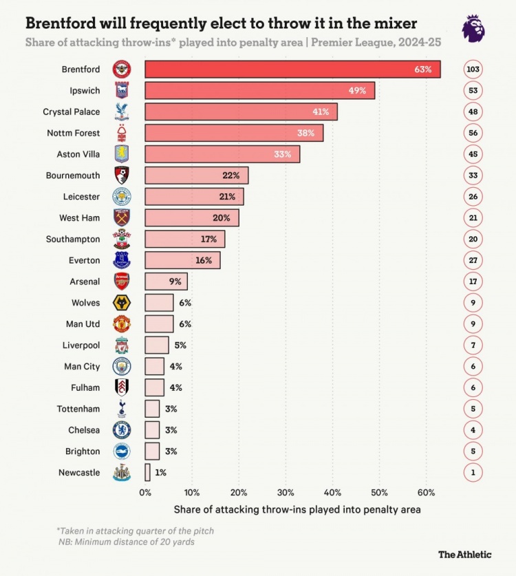 24-25赛季英超球队界外球掷入对方禁区的比率和次数: