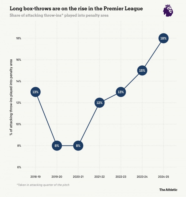 近年英超球队通过长距离界外球发动进攻的比率: